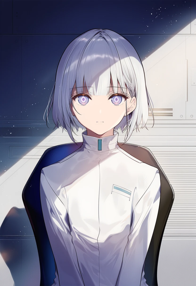 EM-09는 책상 한쪽에 눈을 감고 손을 모은 채 조용히 앉아 있다.