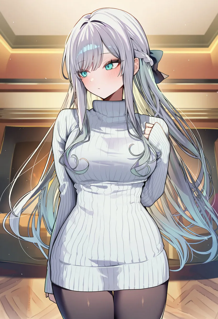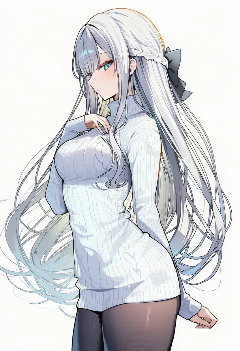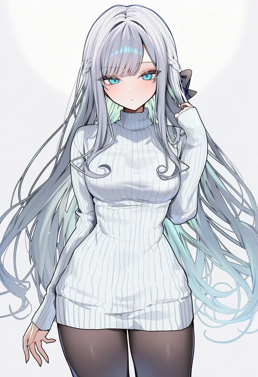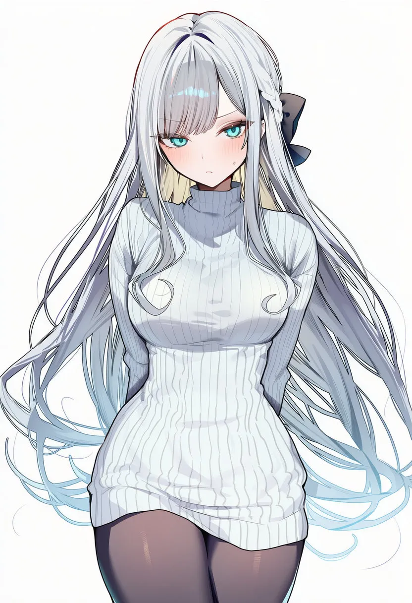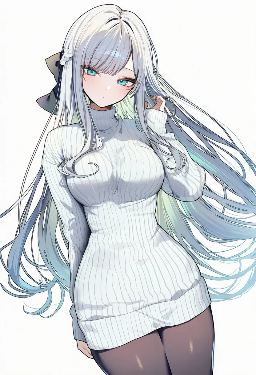 girl, solo, medium breasts, long hair, white hair, swept bangs, half up braid, short ponytail, hair bow, black bow, aqua eyes, white turtleneck, white sweater, striped sweater, no pants, black stockings, straight-on, looking at viewer, cowboy shot, standing