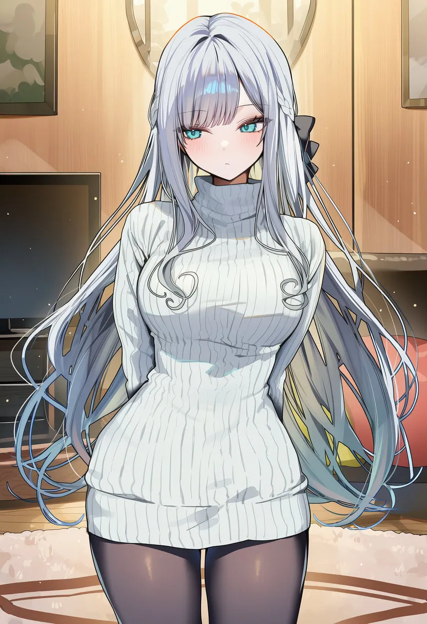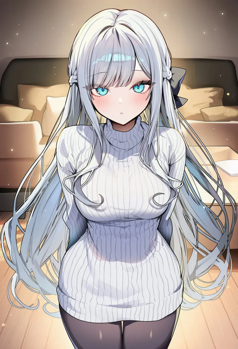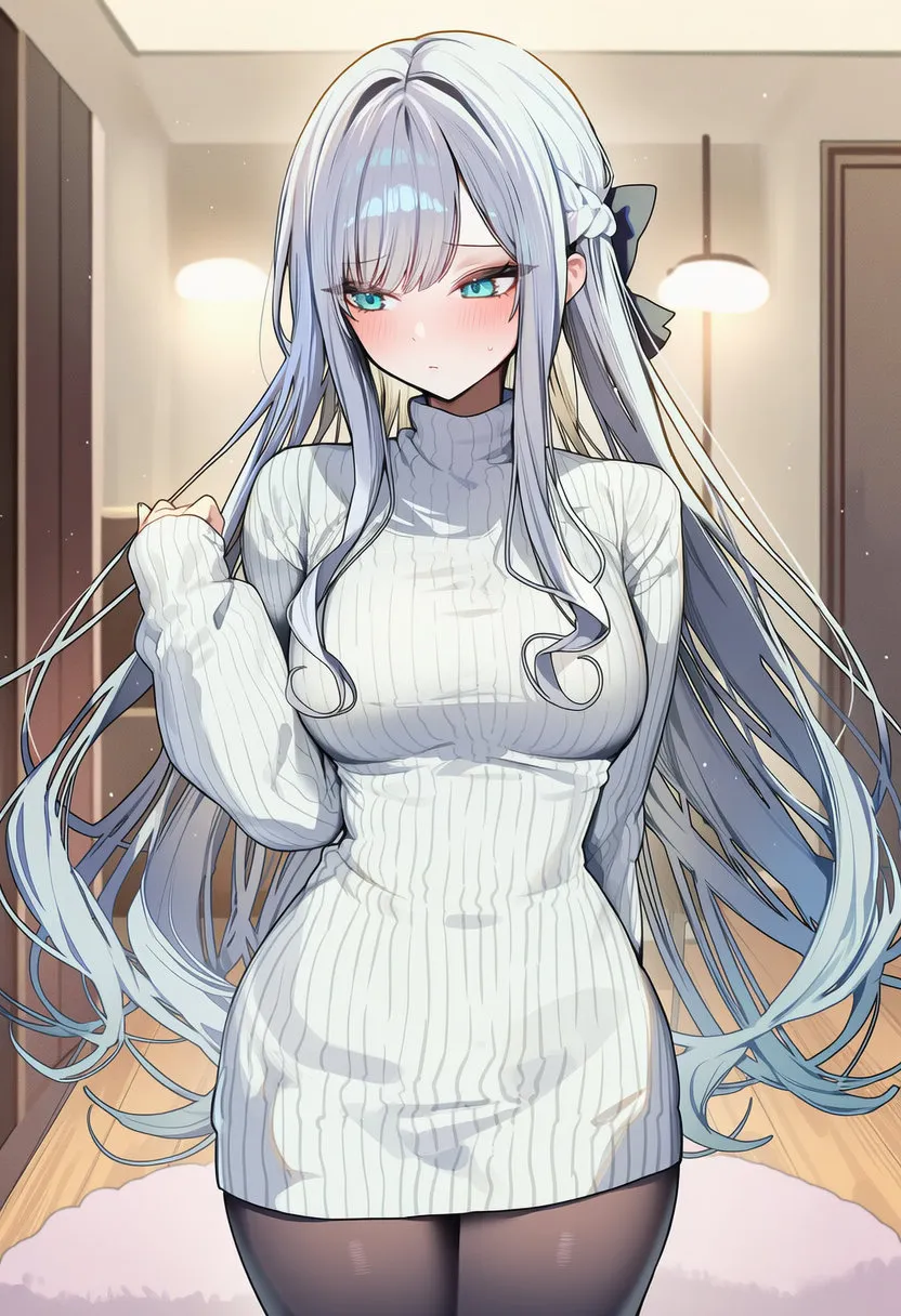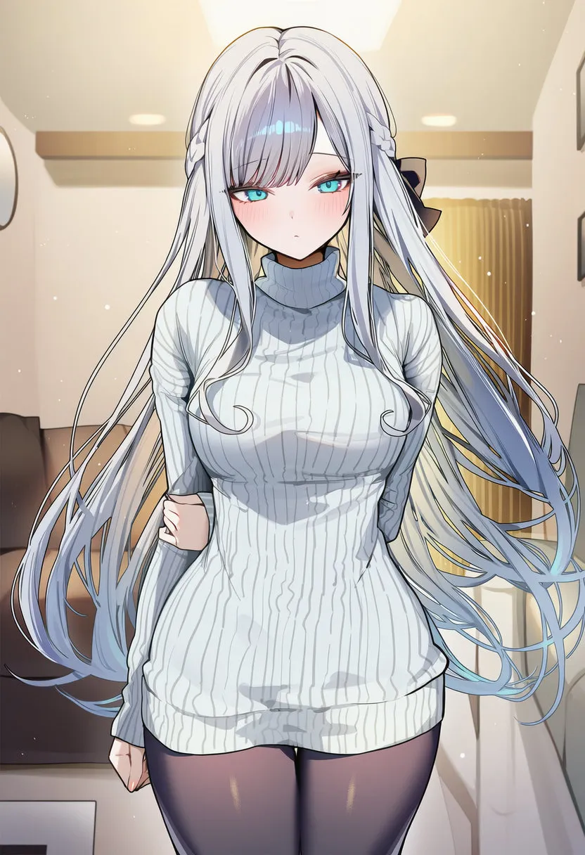 girl, solo, medium breasts, long hair, white hair, swept bangs, half up braid, short ponytail, hair bow, black bow, aqua eyes, white turtleneck, white sweater, striped sweater, no pants, black stockings, straight-on, looking at viewer, cowboy shot, standing