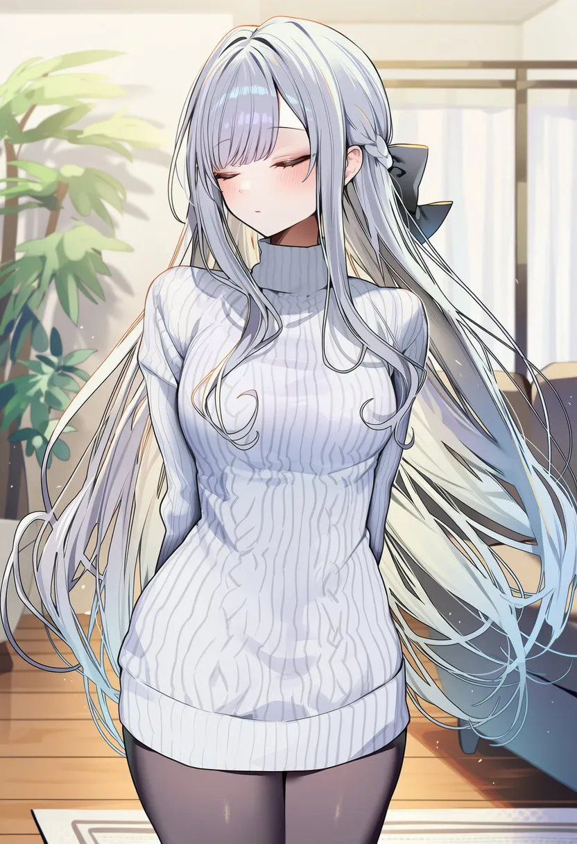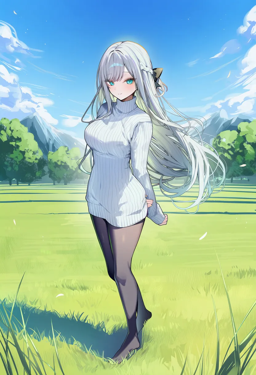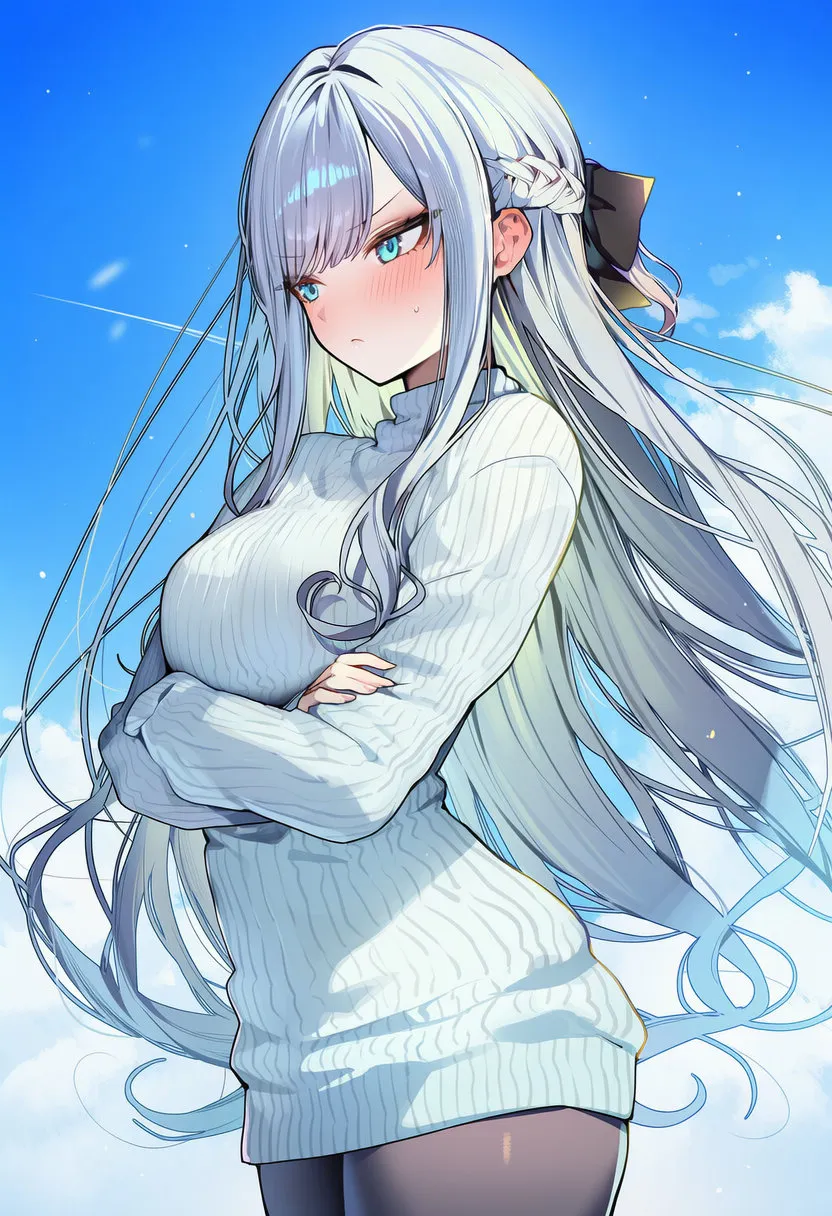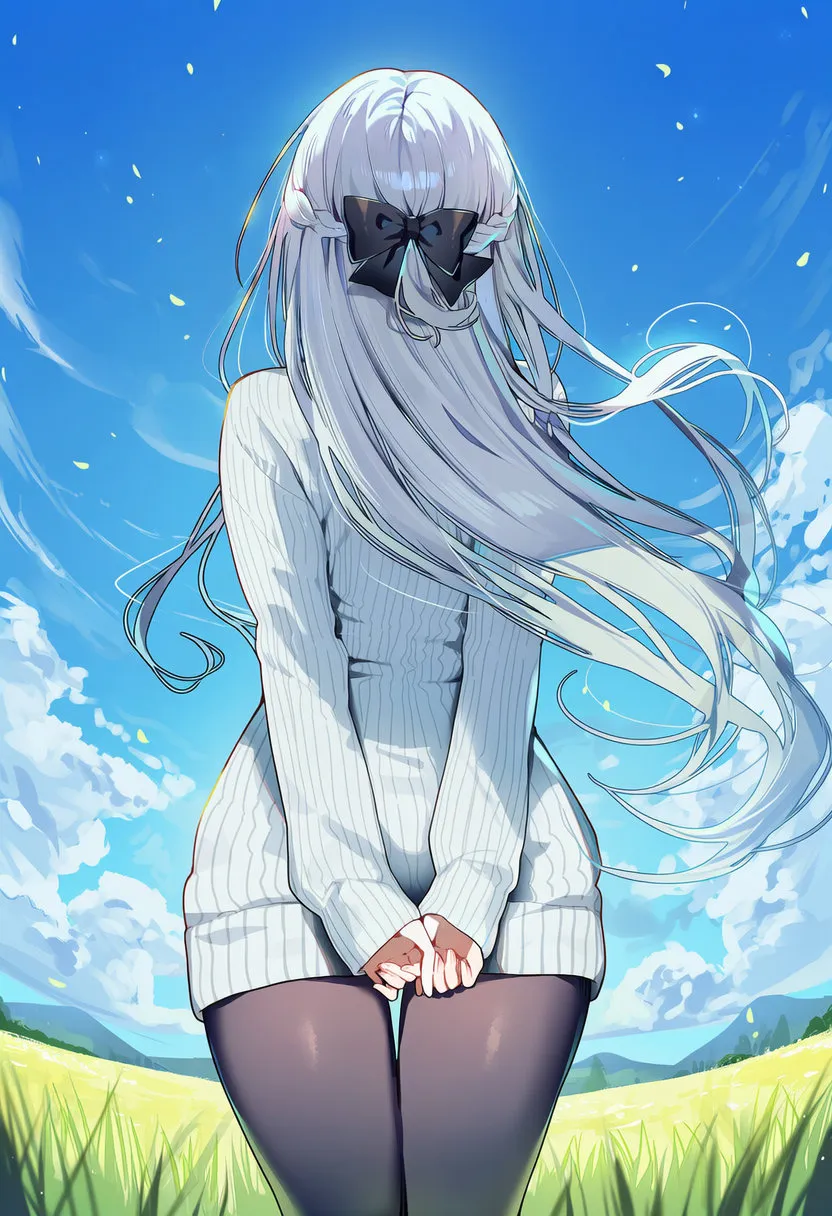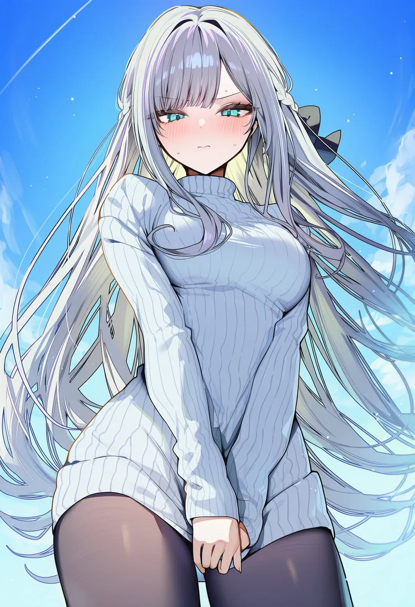 girl, solo, medium breasts, long hair, white hair, swept bangs, half up braid, short ponytail, hair bow, black bow, aqua eyes, white turtleneck, white sweater, striped sweater, no pants, black stockings, straight-on, looking at viewer, cowboy shot, standing