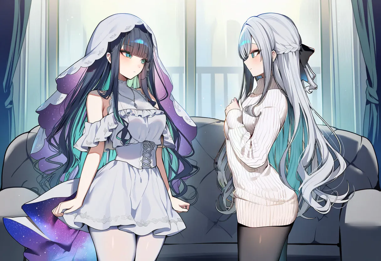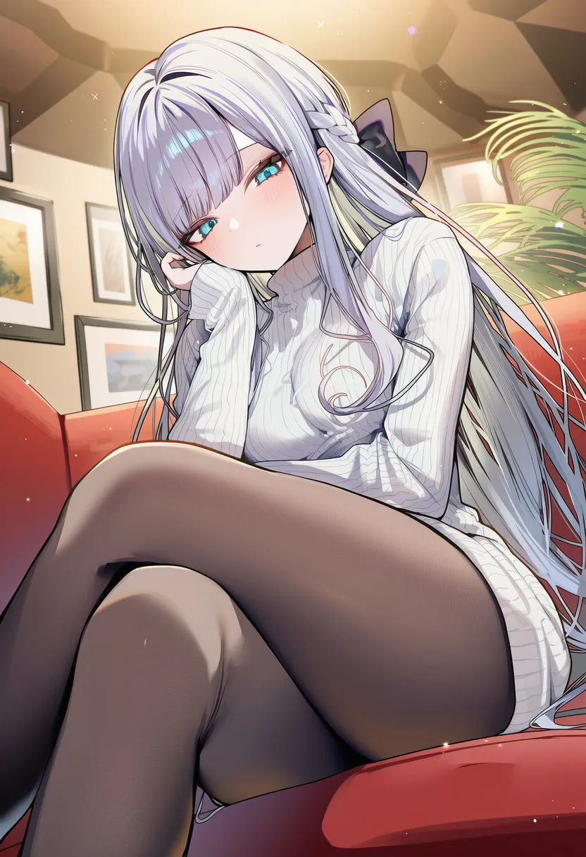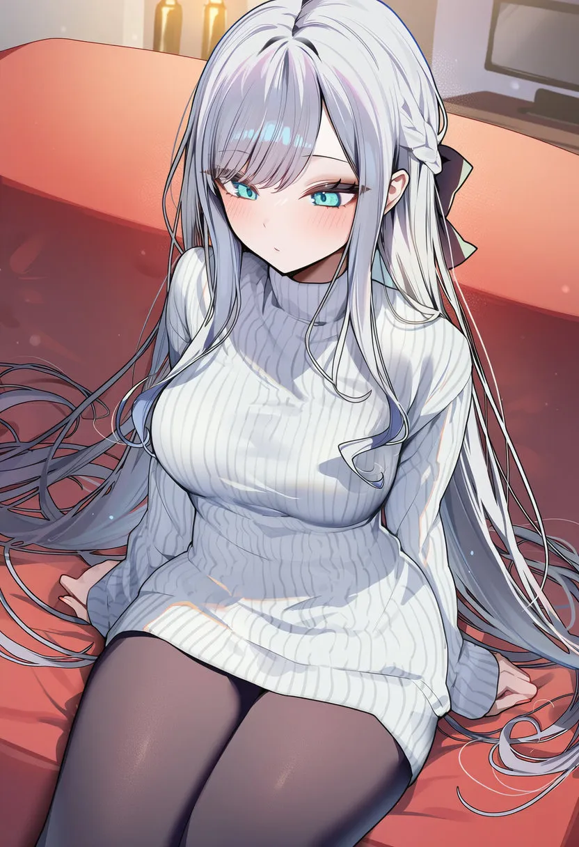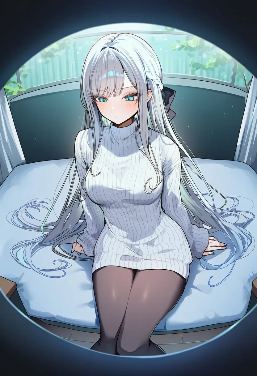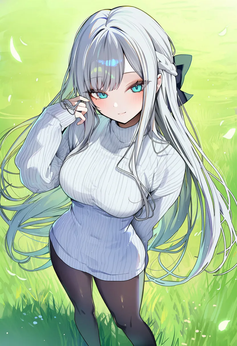 girl, solo, medium breasts, long hair, white hair, swept bangs, half up braid, short ponytail, hair bow, black bow, aqua eyes, white turtleneck, white sweater, striped sweater, no pants, black stockings, straight-on, looking at viewer, cowboy shot, standing