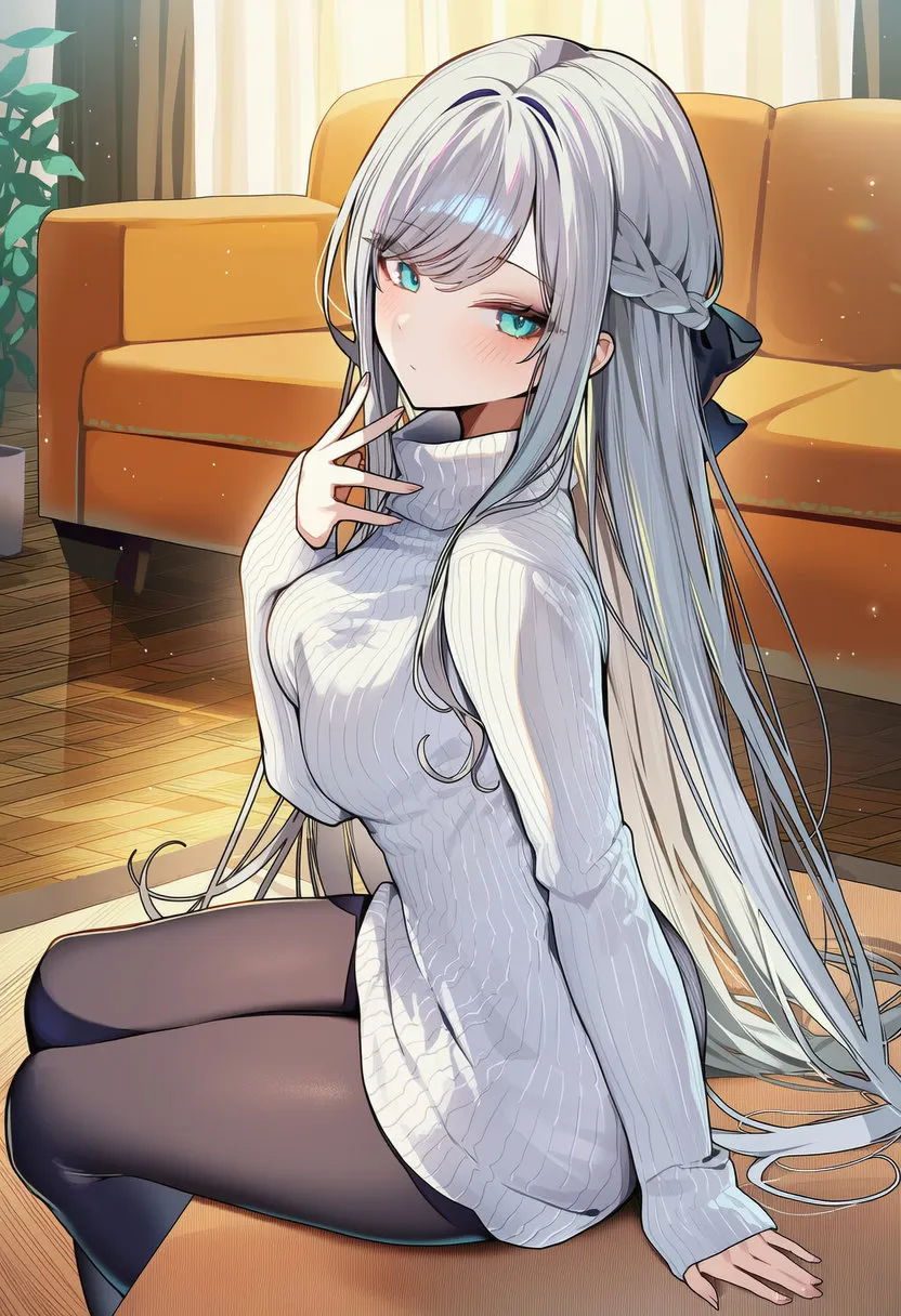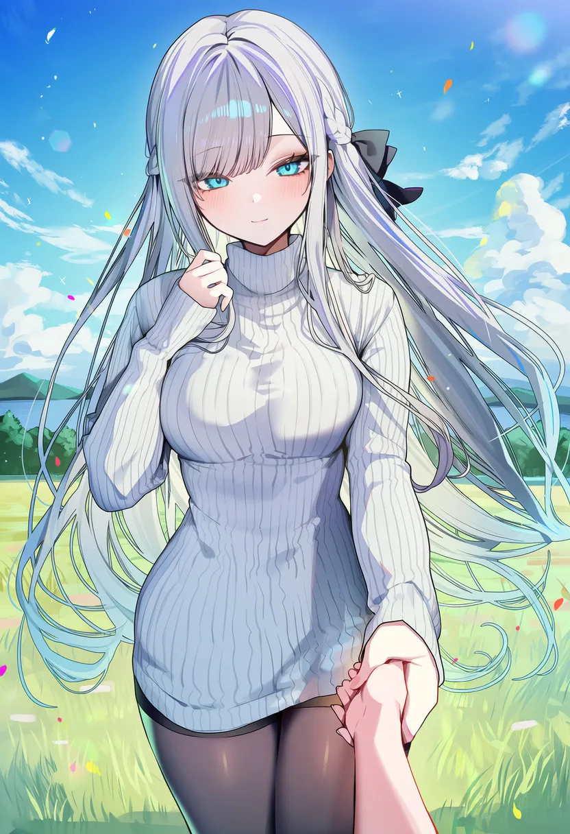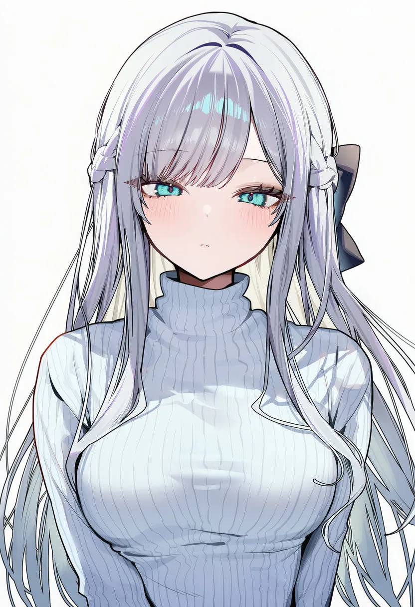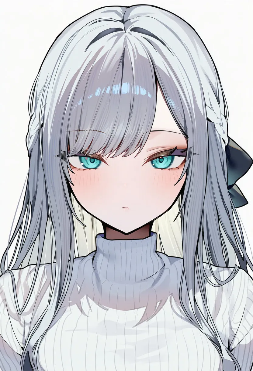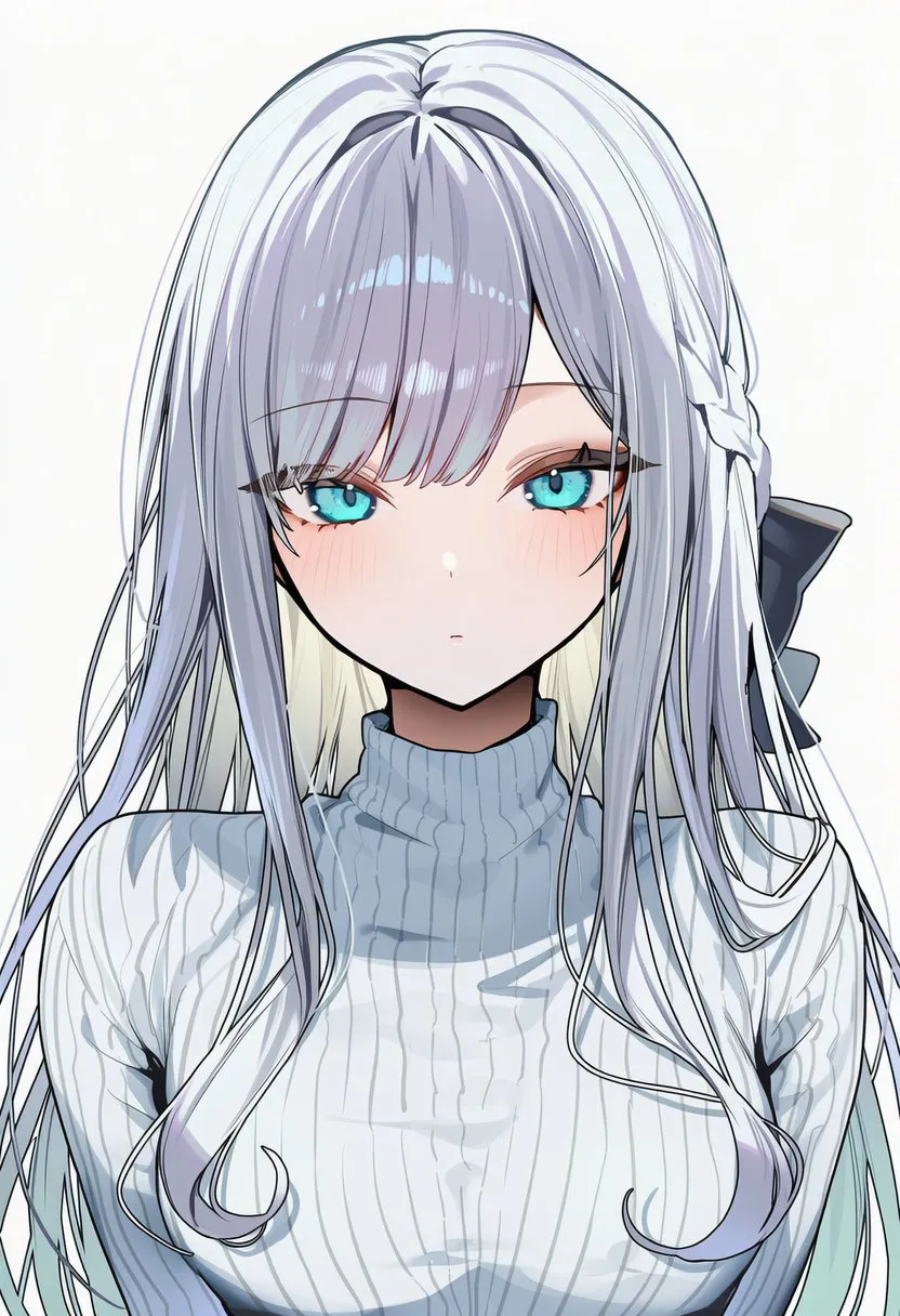 제거: medium breasts, swept bangs, half up braid, short ponytail, hair bow, black bow, aqua eyes, white turtleneck, looking at viewer, cowboy shot
