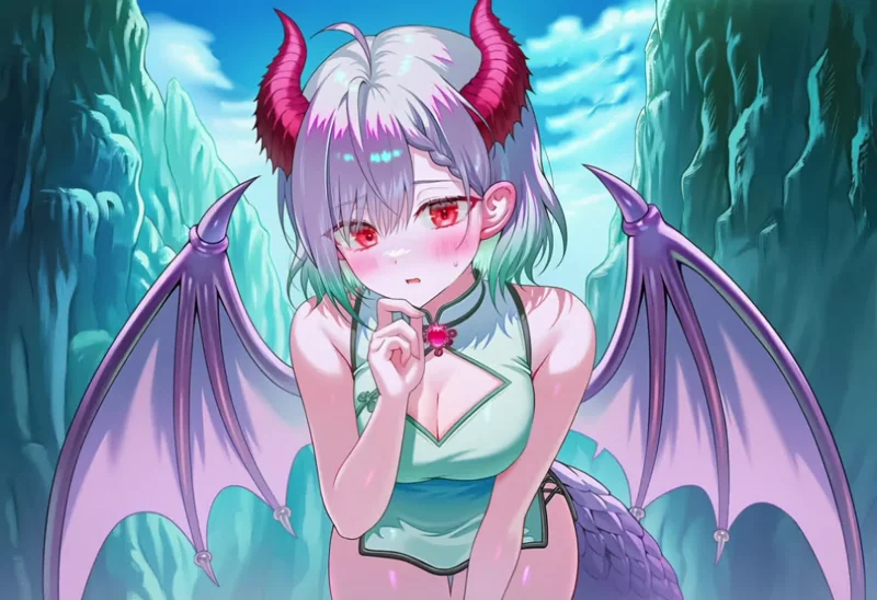 연보랏빛 단발 머리의, 붉은 뿔과 보랏빛 날개를 가진 여성이 당신을 향해 걸어옵니다.